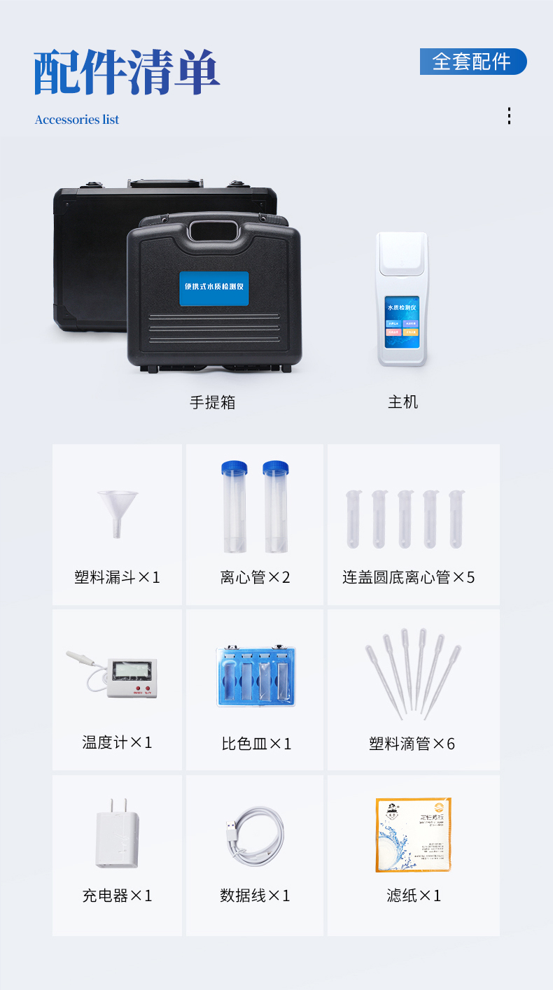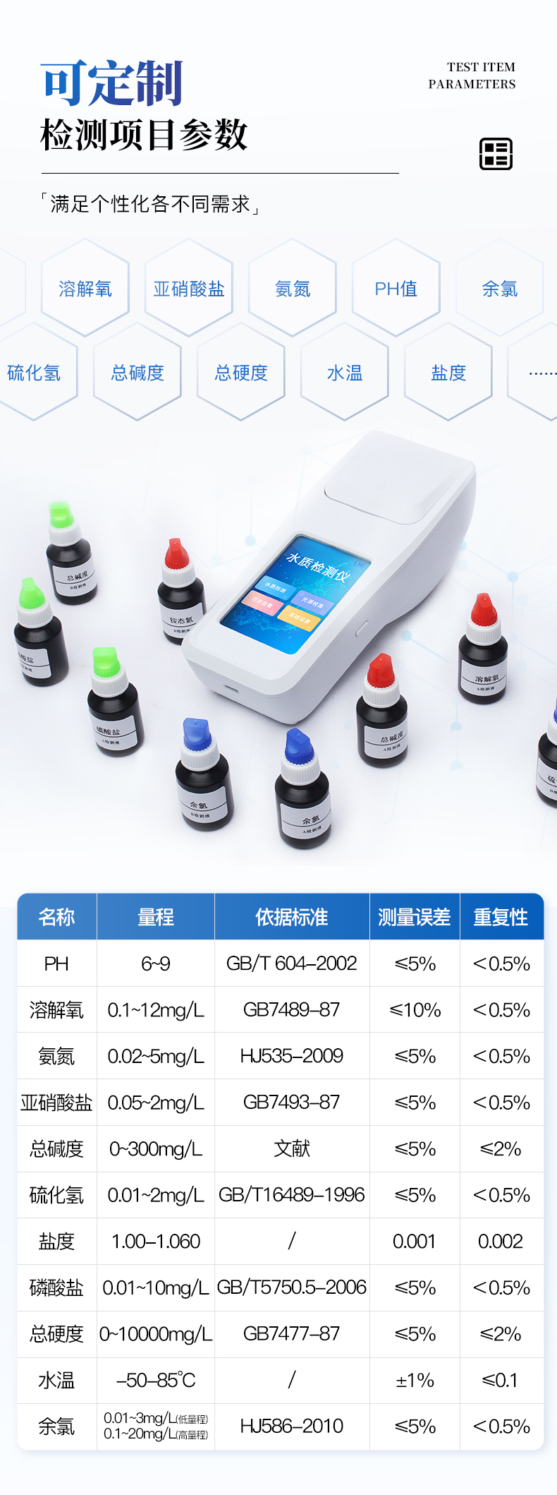 余氯、總氯、有效氯、氨氮、溶解氧、pH、濁度、懸浮物、二氧化氯、臭氧、尿素、色度、氯化物、氰尿酸、硫化氫、亞硝酸鹽、磷酸鹽、總硬度、總堿度、水溫、鹽度等20多種檢測指標任選7種;