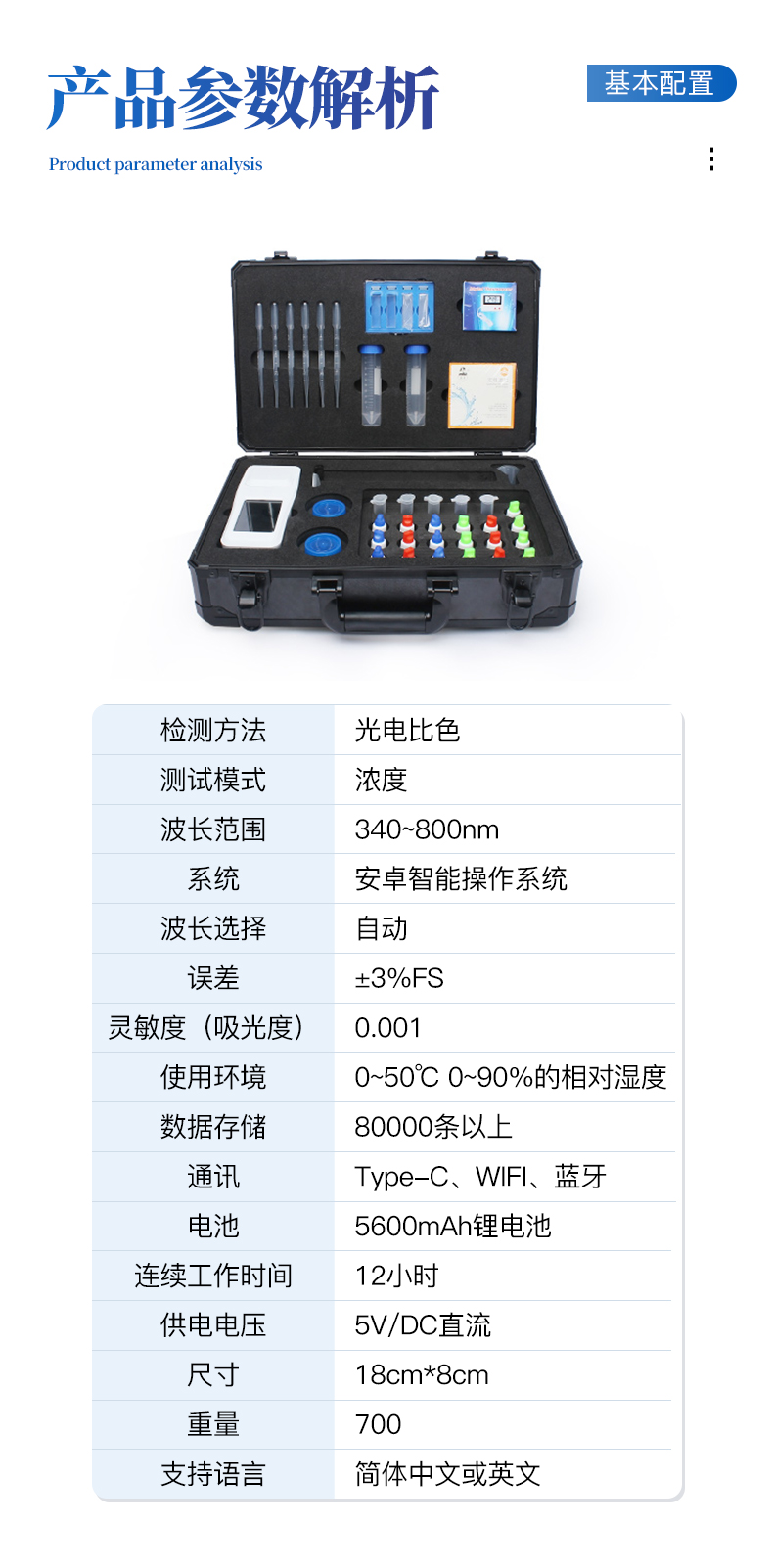簡介:七參數水質檢測儀概述:云唐YT-S07便攜式多參數水質檢測儀是一款適用于工業污水、水產養殖、河流監測、游泳場館等領域的檢測儀,配合快速顯色檢測試劑,可“快速、簡單、準確、穩定”進行測量,擁有精美的外觀造型,簡單的操作界面,準確的檢測系統,幫助用戶獲得精細的數據,可更準確、有效的分析水體狀況。七參數水質檢測