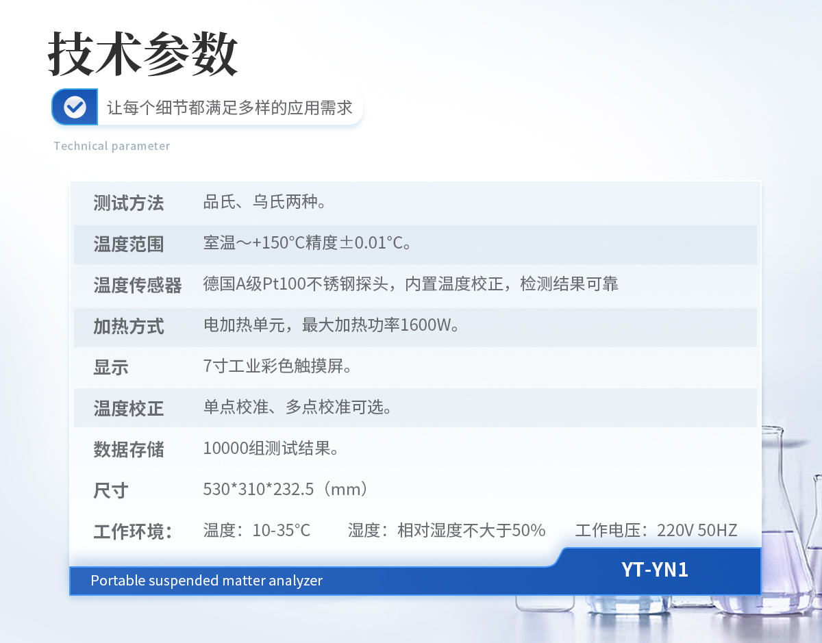 | 測試方法:品氏、烏氏兩種。 | 溫度范圍:室溫~+150°C精度±0.01°C。 | 溫度傳感器:德國A級Pt100不銹鋼探頭,內置溫度校正,檢測結果可靠。 | 加熱方式:電加熱單元,**加熱功率1600W。 | 顯示:7寸工業彩色觸摸屏。 | 溫度校正:單點校準、多點校準可選。 | 數據存儲:10000組測試結果。 | 尺寸:530*310*232.5(mm) | 工作環境: | 溫 度:10-35℃ | 濕 度:相對濕度不大于50% | 工作電壓:220V 50HZ |