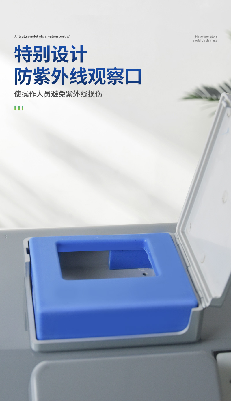 | ★依據行標:NY/T1257-2006 | ★儀器箱體兩側設有雙向操作口,前開門設計,方便取放樣品。 | ★用戶可通過箱體直接觀察到暗室內的樣品。 | ★特別設計防紫外線觀察口,使操作人員避免紫外線損傷。 | ★紫外短波波長:254nm | ★紫外長波波長:365nm | ★可見光源 | ★紫外濾色片尺寸:200×50mm | ★工作電源: 220V交流電源 | ★使用溫度: 0℃-40℃ | ★使用濕度:<90% (40℃) | ★儀器功耗: 20W | ★外型尺寸:300×200×290mm |