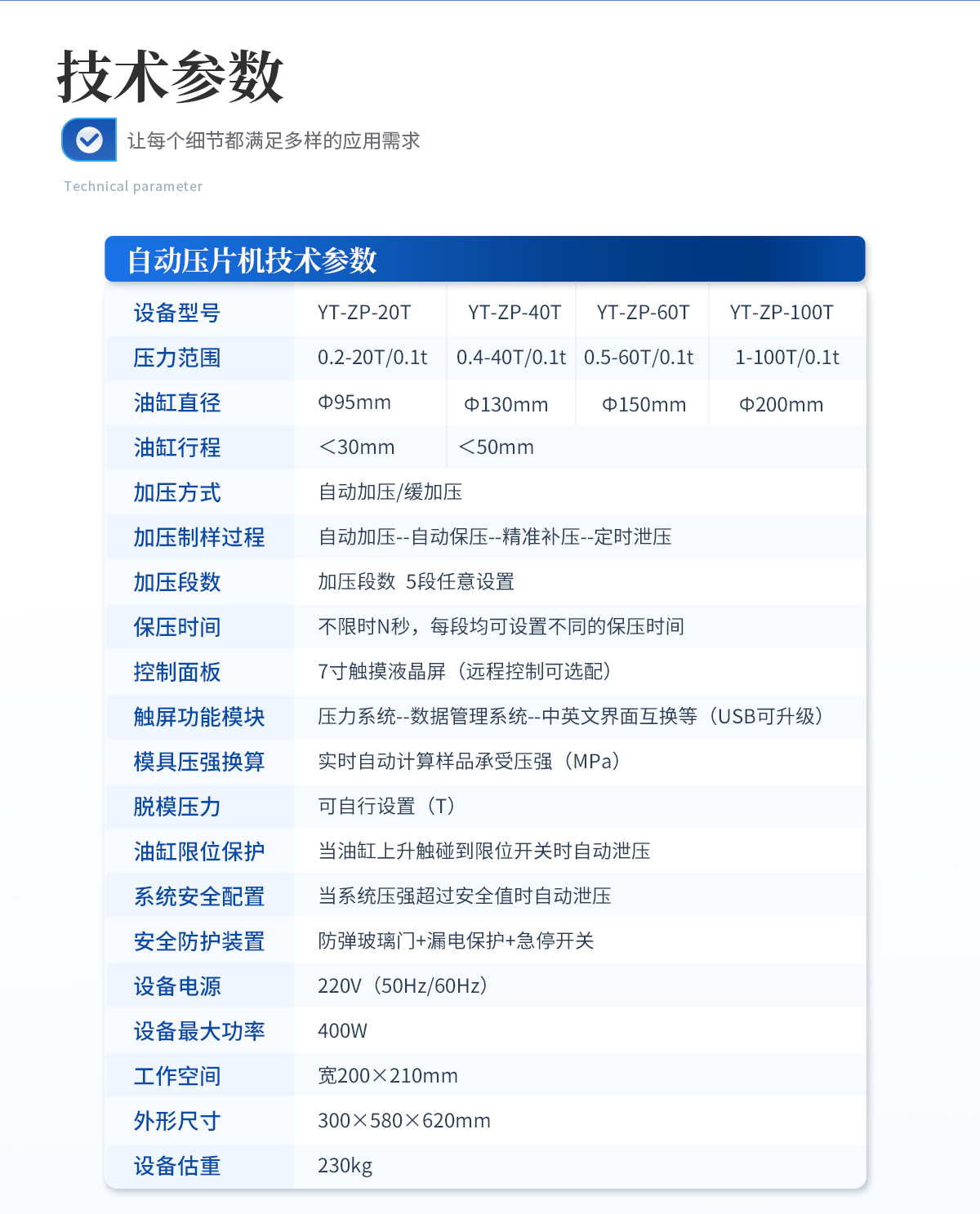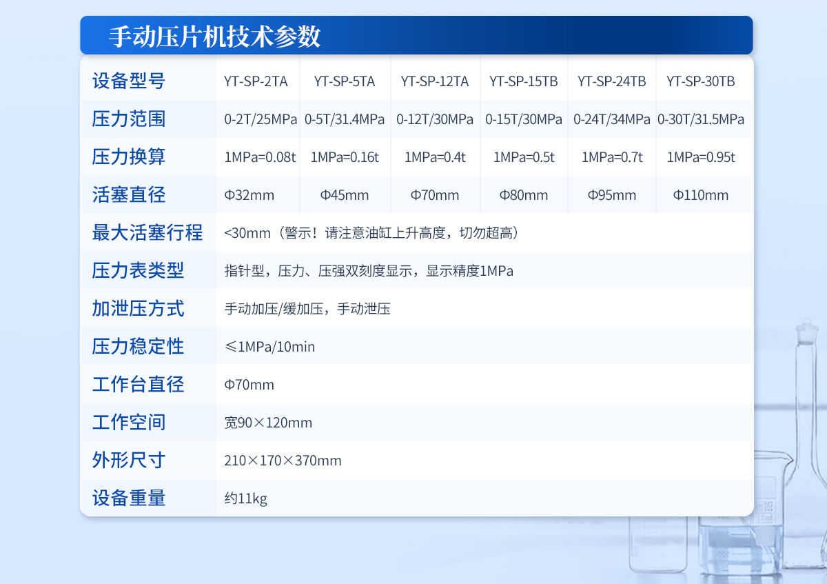 | 設(shè)備型號(hào):YT-ZP-10TH | 壓力范圍:0.1-10T/0.1t | 壓力換算:自動(dòng) | 活塞直徑:Ф95mm | **活塞行程:<30mm | 壓力表類型:7寸 觸摸液晶屏 | 加泄壓方式:自動(dòng)加壓/保壓/補(bǔ)壓/泄壓 | 保壓時(shí)間:不限時(shí)(N秒) | 模具壓強(qiáng)換算:程序自動(dòng)換算 | 油缸限位保護(hù):當(dāng)油缸上升觸碰到限位開(kāi)關(guān)時(shí)自動(dòng)泄壓 | 系統(tǒng)安全配置:當(dāng)系統(tǒng)壓強(qiáng)超過(guò)安全值時(shí)自動(dòng)泄壓 | 安全防護(hù)配置:防彈玻璃門+漏電保護(hù)+急停開(kāi)關(guān) | 數(shù)據(jù)管理:壓力系統(tǒng)--數(shù)據(jù)管理系統(tǒng)--中英文界面互換等(USB可升級(jí)) | 設(shè)備電源:220V(50Hz/60Hz) | 工作臺(tái)直徑:Φ125mm | 工作空間:寬145×160mm | 外形尺寸:230×390×420mm | 設(shè)備重量:85kg | 配置說(shuō)明:壓片機(jī)1臺(tái),Φ13mm紅外模具1套,瑪瑙研缽1套,溴化鉀1瓶,樣品勺1個(gè) (可拆液體池,紅外烤燈為選配) |