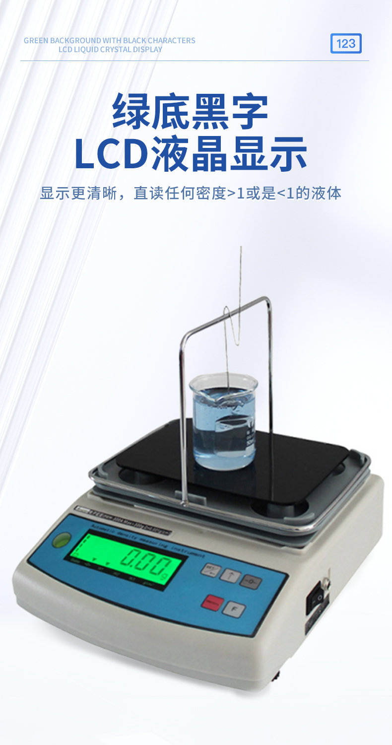 | 1.直讀任何密度>1或是<1的液體. | 2.具有溫度補(bǔ)償設(shè)定、溶液補(bǔ)償設(shè)定功能,更人性化的操作、更符合現(xiàn)場作業(yè)需求 | 3.密度測量臺(tái)一體注塑成型,安裝方便快速,使用時(shí)間更長. | 4.采用不銹鋼T型架具有極強(qiáng)的耐腐蝕性,專用砝碼掛鉤極大地降低了吊欄線浮力所造成的誤差 | 5.具有密度上、下限功能,可判定待測物的比重合格與否。設(shè)有蜂鳴器裝置 | 6.內(nèi)置蓄電池,選配防風(fēng)罩,更適合現(xiàn)場測試. | 7. 綠底黑字LCD液晶顯示,顯示更清晰 |