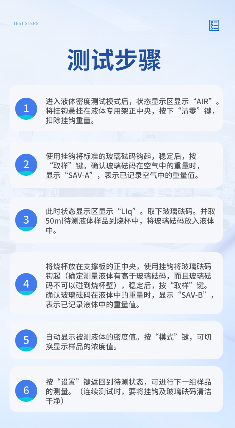| 1、進(jìn)入液體密度測試模式后,狀態(tài)顯示區(qū)顯示“AIR”。 將掛鉤懸掛在液體專用架正中央,按下“清零”鍵,扣除掛鉤重量。 | 2、使用掛鉤將標(biāo)準(zhǔn)的玻璃砝碼鉤起,穩(wěn)定后,按“取樣”鍵。確認(rèn)玻璃砝碼在空氣中的重量時(shí),顯示“SAV-A”,表示已記錄空氣中的重量值。 | 3、此時(shí)狀態(tài)顯示區(qū)顯示“LIq”。取下玻璃砝碼。并取50ml待測液體樣品到燒杯中,將玻璃砝碼放入液體中。 | 4、將燒杯放在支撐板的正中央,使用掛鉤將玻璃砝碼鉤起(確定測量液體有高于玻璃砝碼,而且玻璃砝碼不可以碰到燒杯壁),穩(wěn)定后,按“取樣”鍵。確認(rèn)玻璃砝碼在液體中的重量時(shí),顯示“SAV-B”,表示已記錄液體中的重量值。 | 5、自動(dòng)顯示被測液體的密度值。按“模式”鍵,可切換顯示樣品的濃度值。 | 7、按“設(shè)置”鍵返回到待測狀態(tài),可進(jìn)行下一組樣品的測量。(連續(xù)測試時(shí),要將掛鉤及玻璃砝碼清潔干凈) | 儀器尺寸:195*220*190mm | 包裝尺寸:430*200*360mm | 包裝重量:4kg | 測試時(shí)間:約5秒 顯示值: 密度、體積 溫度補(bǔ)償: 溶液溫度可設(shè)定至0~100℃ 溶液補(bǔ)償: 溶液可設(shè)定至19.999 |