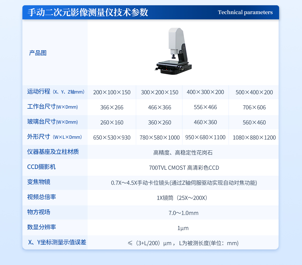 | 儀器基座 精磨高精度高穩(wěn)定性硬質(zhì)鑄鋁 1套 | CCD 700TVL模擬信號高清彩色CCD(COMST) 1個 | 鏡頭 0.7~4.5 X連續(xù)變焦鏡頭 1個 | 光柵尺 高精度位移傳感電子尺,分辨率:1μm (精微) 2條 | 導(dǎo)軌 咸陽藍(lán)博P級精密交叉導(dǎo)軌(LB) 3組 | 傳動 西德無牙光桿精密傳動(西德) 3條 | 表面光源 LED恒流環(huán)形驅(qū)動光源 (兩環(huán)一區(qū)) 1個 | 底光源 LED白色恒流底光源 1PCS | 數(shù)據(jù)采集卡 DC3000 1PCS | 視頻采集卡 視頻采集卡 1PCS | 影像測量軟件 DTV 2.5T手動影像測量軟件 1套 | 光學(xué)校正片 DTV 定制 1塊 | 電壓 AC :100-240V(全電壓) 1個 |