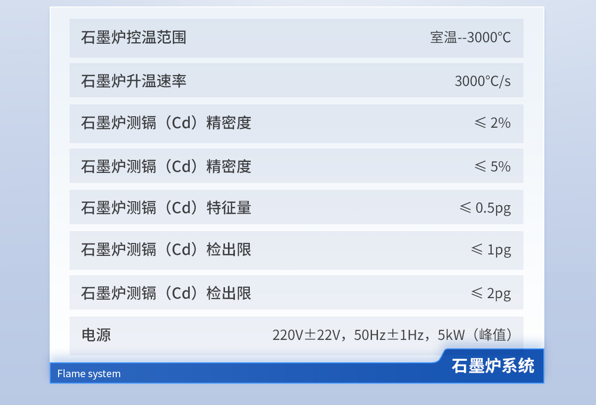 整機單色器類型:切爾尼-特納型(Czerny-Turner) 波長范圍:190nm~900nm 波長準確度:±0.25nm 波長重復性:< 0.05nm 光譜帶寬:0.1/0.2/0.4/0.7/1.4 nm 五檔自動切換 火焰系統 精密度:< 0.8%(火焰法測銅) 檢出限:< 0.008ug/mL 特征濃度:< 0.025μg/ml/1%(火焰法測銅) 靜態穩定性: 0.003 Abs(static) 動態穩定性: 0.004 Abs(dynamic) 石墨爐系統 石墨爐控溫范圍:室溫--3000℃ 石墨爐升溫速率:3000℃/s 石墨爐測鎘(Cd)精密度:≤ 2% 石墨爐測鎘(Cd)精密度:≤ 5% 石墨爐測鎘(Cd)特征量:≤ 0.5pg 石墨爐測鎘(Cd)檢出限:≤ 1pg 石墨爐測鎘(Cd)檢出限:≤ 2pg 電源:220V±22V,50Hz±1Hz,5kW(峰值)