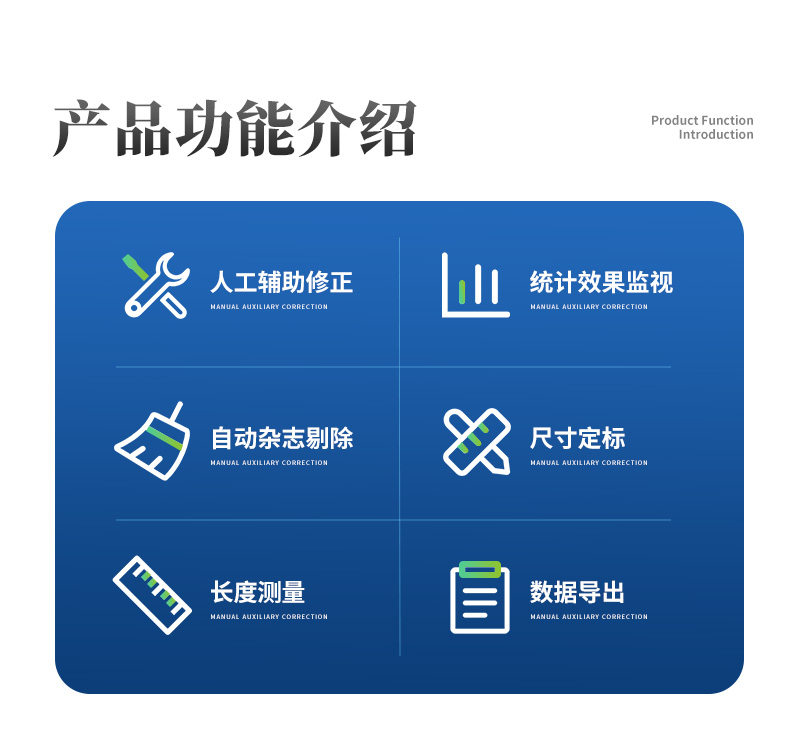 | 1、人工輔助修正:圖像可放大縮小和局部觀察。 | 2、統計效果監視:監視和修正植物對象分析的精度。 | 3、自動雜質剔除:根據尺寸等方面的區別,進行自動雜質剔除。 | 4、輔助測量功能:尺寸標定:自帶標定功能,實現半自動的尺寸標定,XY向可分別標定修正。 | 長度測量:具有跟隨放大鏡功能,通過鼠標拖動**測量。數據導出:分析圖像、分布圖、結果數據可保存,分析結果輸出至Excel表,可輸出分析標記圖。 |